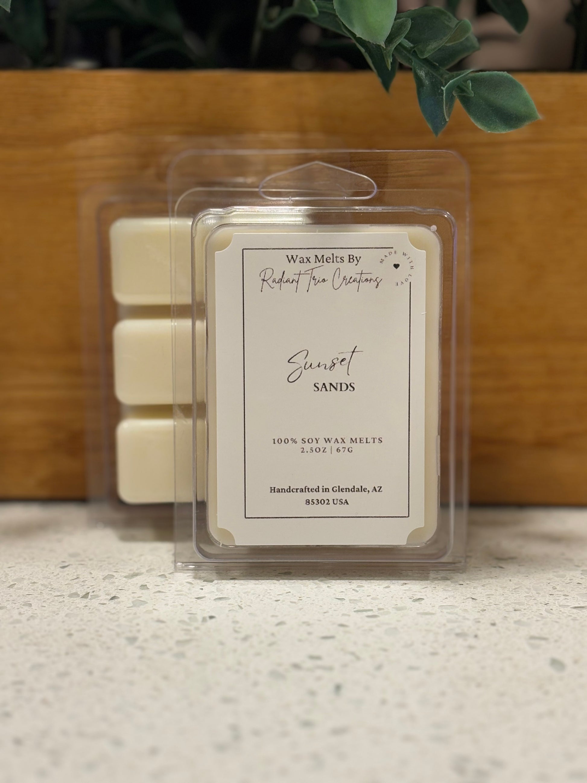 Unwind with our 2.5oz Sunset Sands Wax Melts, made with premium soy wax. Experience a cleaner and longer burn time with 100% natural ingredients.